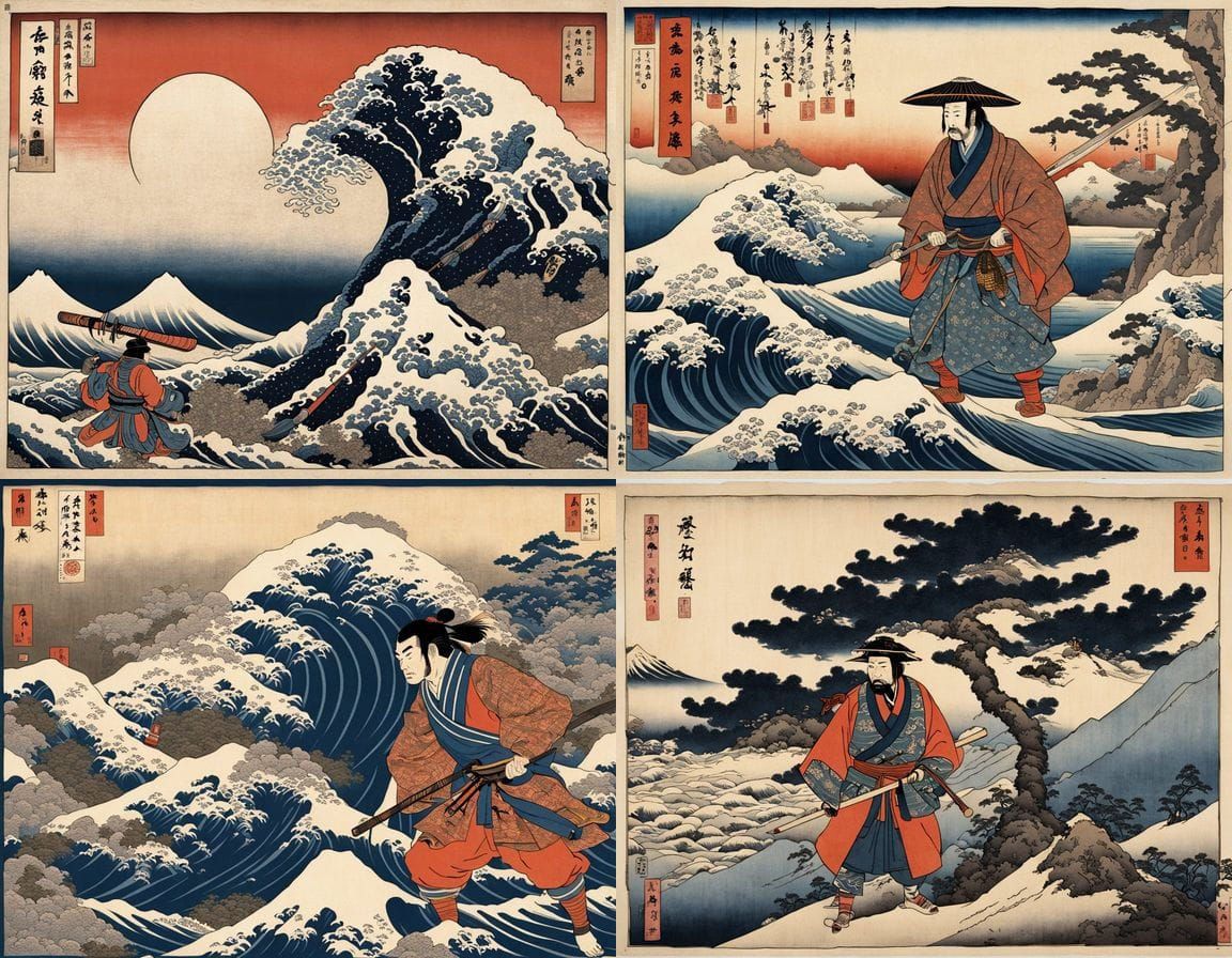 This image shows a samurai explorer in the style of Ukiyo-e Japanese art. The composition and linework evokes the style of Hokusai.