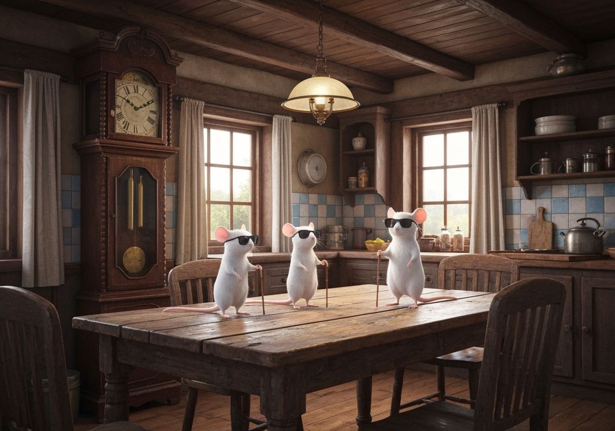 This image shows a rustic cottage kitchen interior with a prominent antique grandfather clock. Three white mice wearing sunglasses and holding walking sticks stand on a wooden table in ultra-realistic 8K quality.
