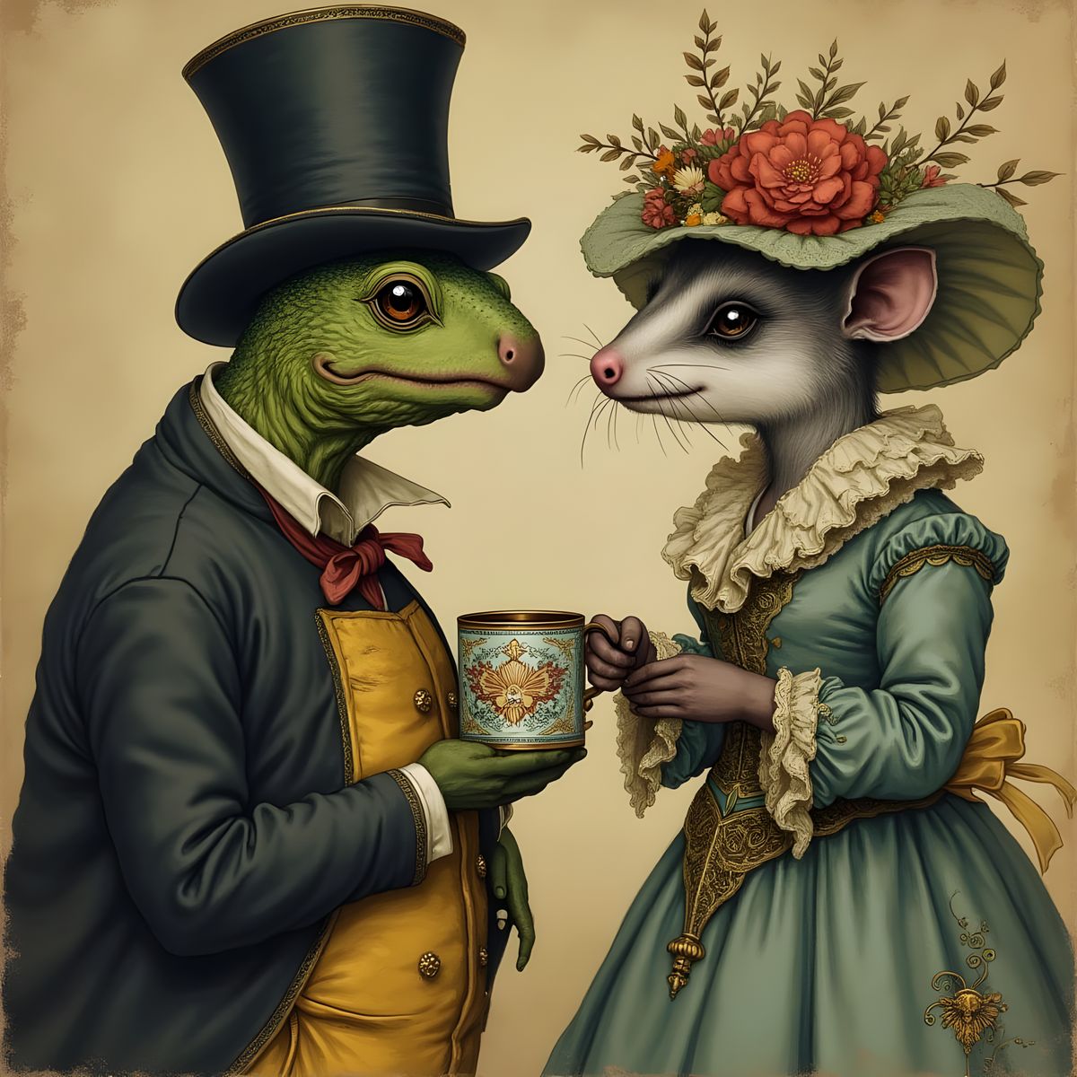 This image shows an anthropomorphic turtle in a top hat conversing with a female possum wearing a Victorian dress and hat. The image has a highly detailed and whimsical style.