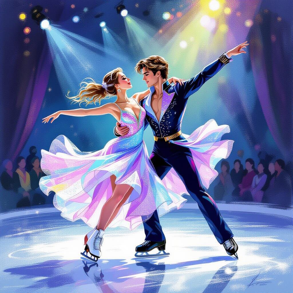 This image shows chalk art of male and female ice skaters performing a dynamic death spiral. The female skater is in a sparkly chiffon dress, with vivid colors and glowing stage lights.