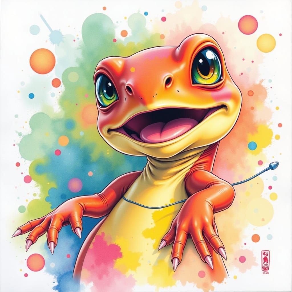This image shows a photorealistic watercolor of Charmander. The artwork is rendered in pastel colors and combines elements of kinetic art and surrealist illustration.