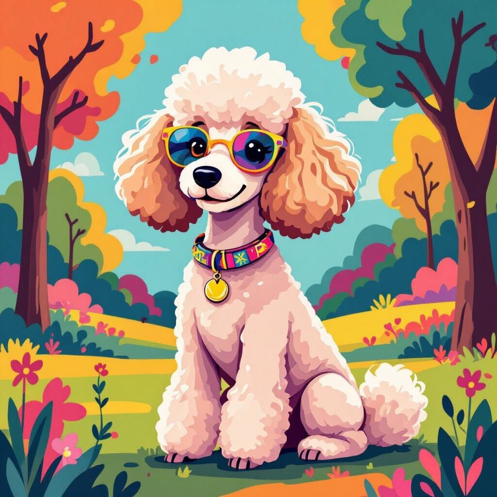 This image shows a poodle sporting trendy accessories in a vibrant park setting. The artwork is rendered with bold lines, playful textures, and a colorful palette, as modern digital art.