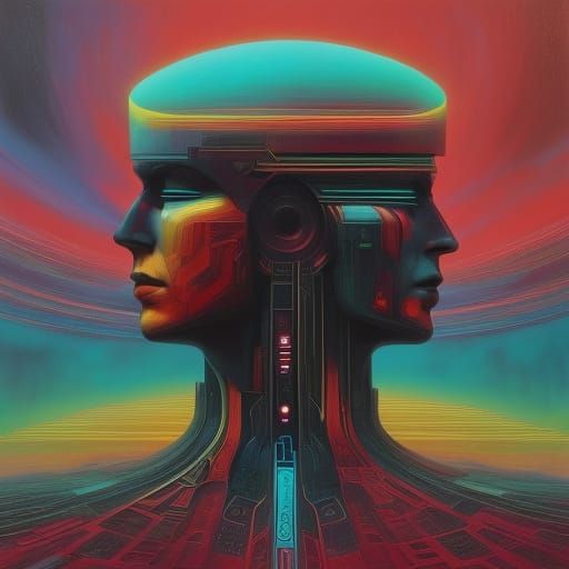 This abstract collage features a faceless figure in a retro-futuristic style, with floating geometric shapes, clouds, and intricate line patterns. Ethereal lighting and vibrant gradients enhance the modern graphic illustration.