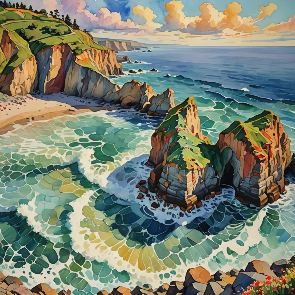 A vibrant coastal scene featuring a pebble beach and dramatic cliffs. The artwork evokes an impressionist style with thick brush strokes and layered textures, reminiscent of gouache and watercolor techniques.