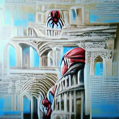 A digital painting depicting Spider-Man in an Assassin's Creed setting, surrounded by Roman architecture. The artwork is detailed and symmetrical, reminiscent of Renaissance paintings in acrylic.