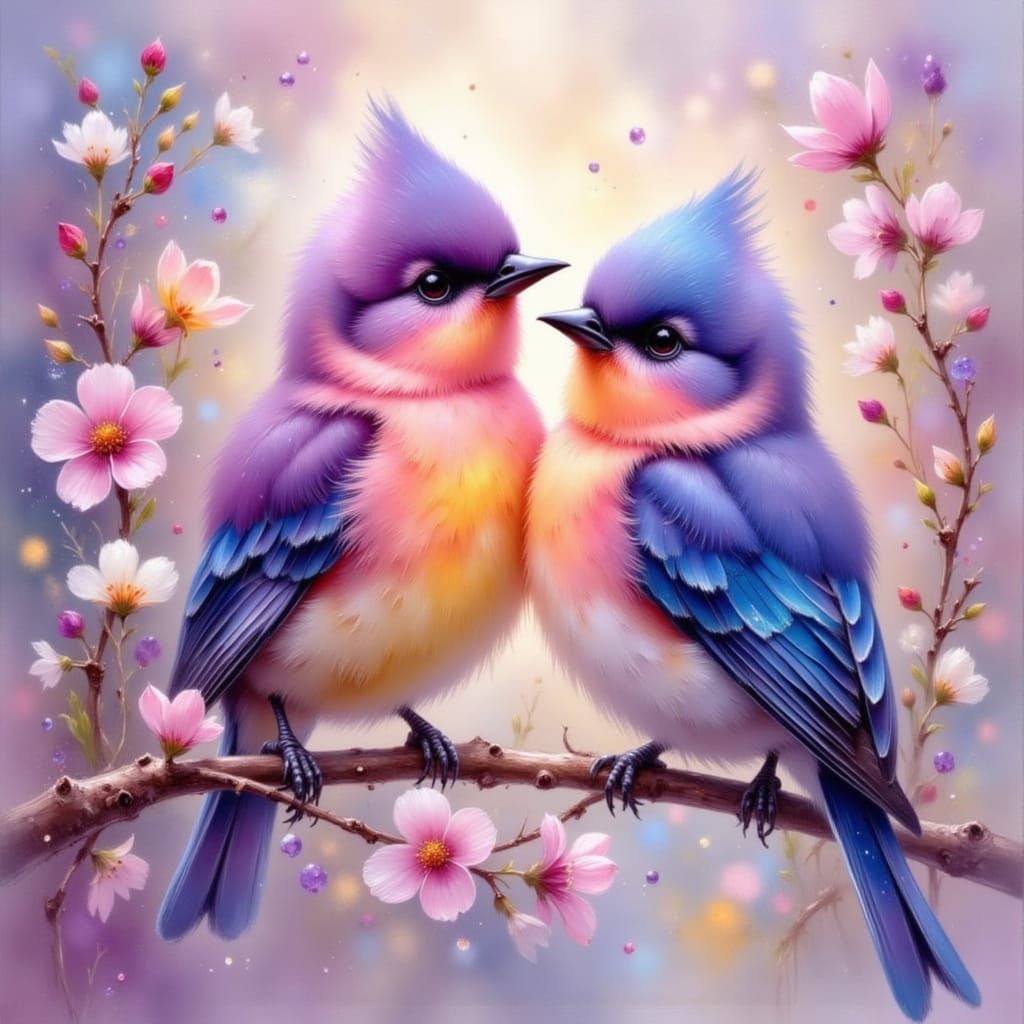 A striking picture of two lovebirds intertwined on a branch. The birds are painted in soft rose and lavender hues, as an impressionist painting with vivid, dewdrops.