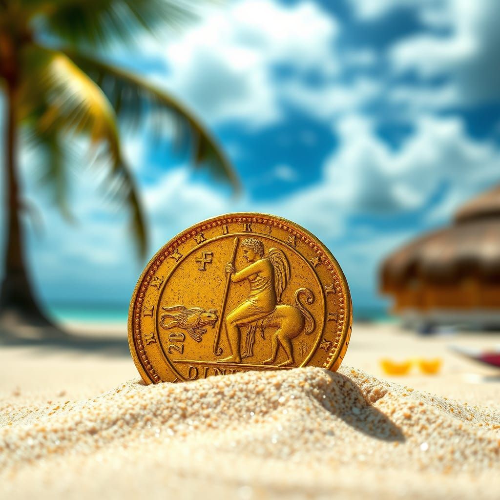 This image shows an ancient Greek gold coin partially buried in the sand on a tropical beach. The hyperrealistic image features vibrant colors and intricate details with a cinematic aesthetic.