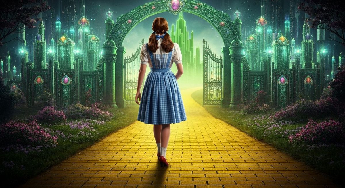 This image shows a double exposure artwork of Dorothy on the yellow brick road to the Emerald City. It is a fantasy silhouette with intricate details.