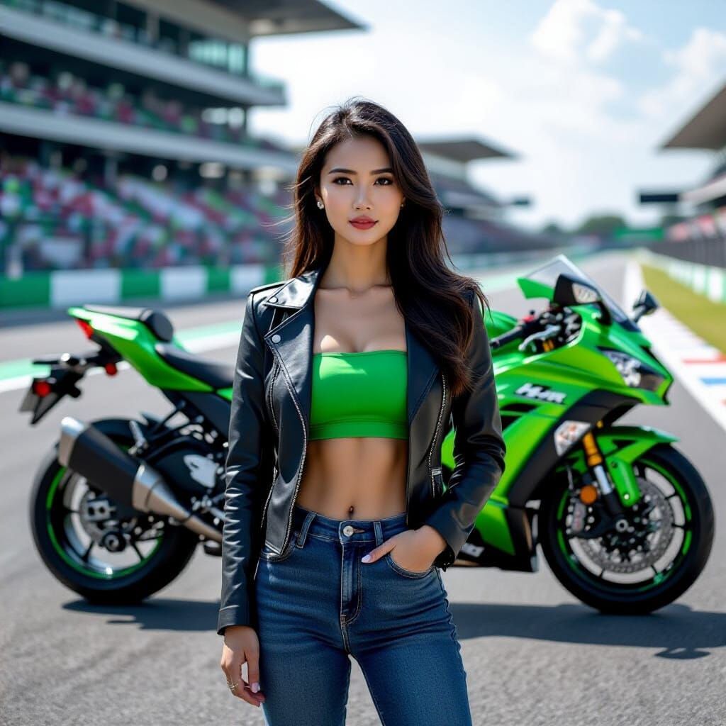 This image shows a beautiful Thai woman in casual attire standing on a racetrack next to a sparkling green Kawasaki H2R sport bike. She is wearing a well-fitted jacket and blue jeans.