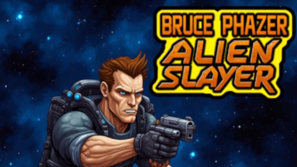This image shows a gritty, industrial space ranger clad in a metallic exosuit, aiming a high-tech phaser gun with glowing blue accents. A distressed logo in the top right corner reads 'Bruce Phazer Alien Slayer' in a futuristic font.
