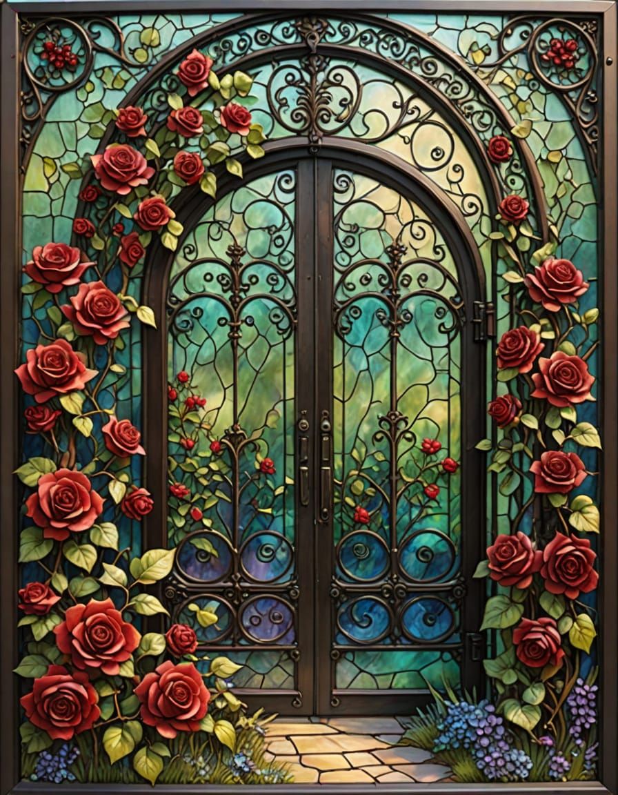 A breathtaking stained glass image of an ornate iron garden gate, framed by blooming roses. Features iridescent metals, intricate bronze detailing, and ruby gems with sparkling light.