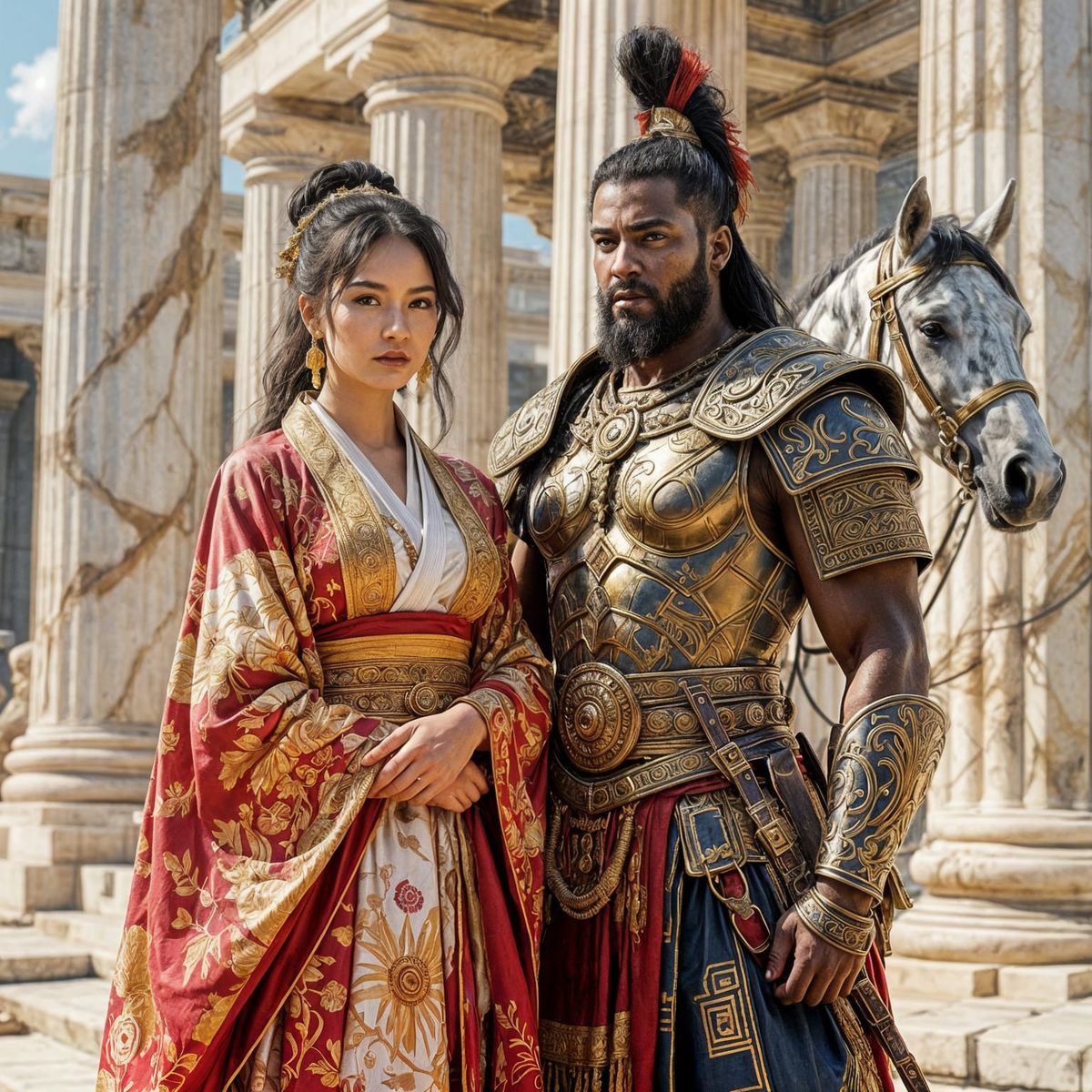 This image shows an Asian woman in silk robes embraced by an African warrior in tribal armor. A horse stands behind them against an Ancient Greek backdrop, rendered with cinematic lighting and digital painting techniques.