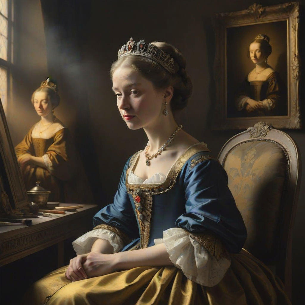 A regal queen poses in a dimly lit studio, reminiscent of classic Dutch Golden Age paintings. The scene captures artistic dedication and royal poise, rendered with visible brushstrokes and muted colors.