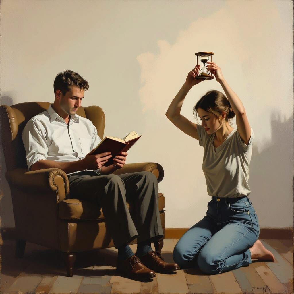 This image depicts a man reading in a minimalist setting as a woman kneels, holding an hourglass. The scene evokes a serene yet moody atmosphere with realistic lighting, inspired by classic American realism.
