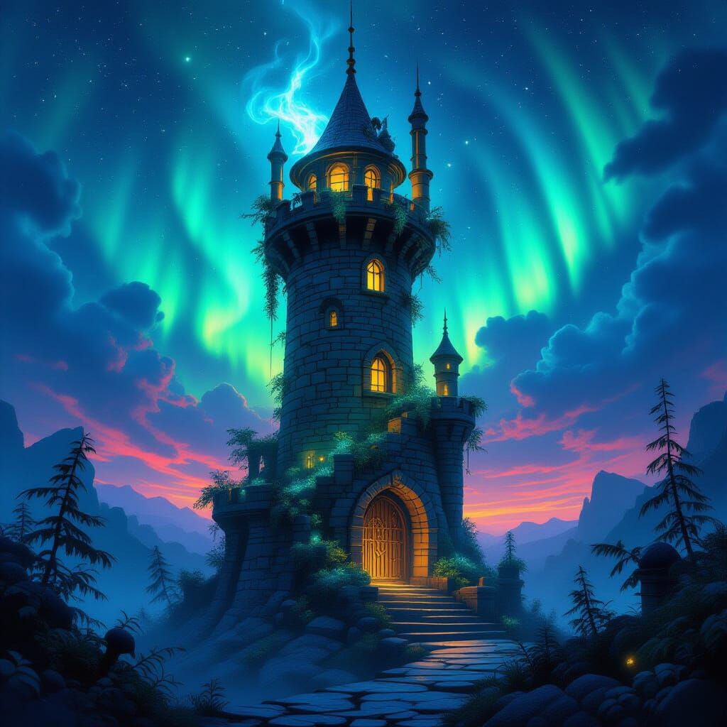 A dark fantasy concept art piece depicts an ancient, overgrown alchemist tower glowing mysteriously under a swirling aurora borealis, with dramatic lighting and deep colors.