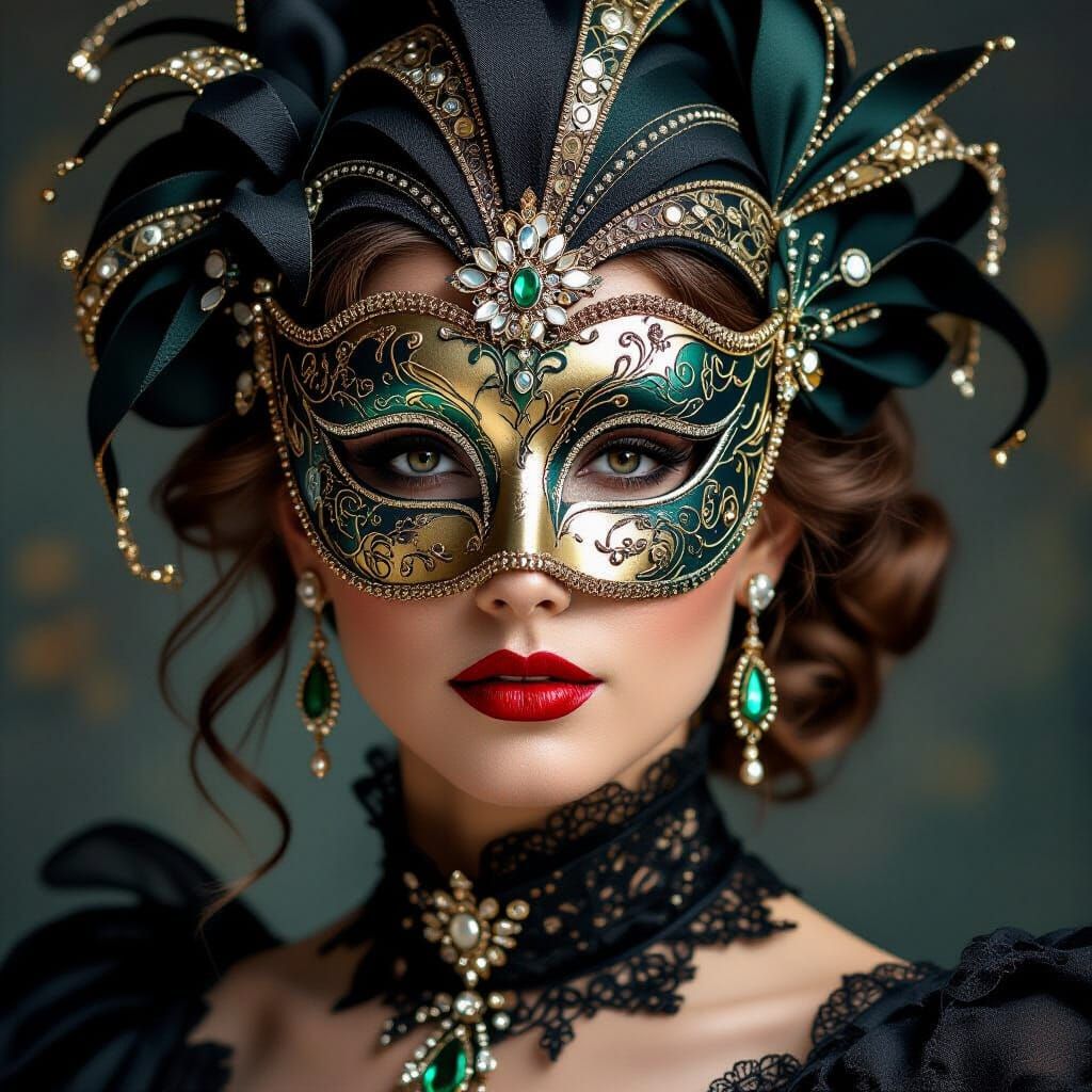 This image features a woman wearing a highly detailed, elegant masquerade mask, evoking an atmosphere of mystery, fantasy, and magic.