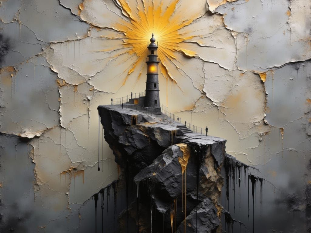 No es la piedra la que guía a los barcos, sino la voluntad del óleo. Un faro de luz sólida se desmorona en grietas de oro, mientras su base se deshace en un río de sombras que busca el borde del lienzo.