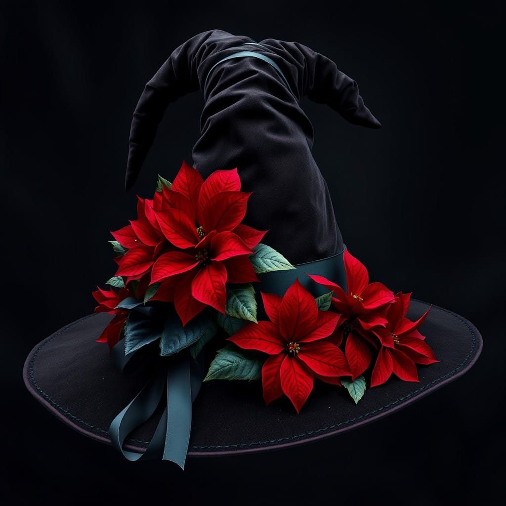 This image showcases a detailed witch hat adorned with crimson poinsettias and a sparkling black ribbon. Rendered in a matte painting style with vivid colors, it evokes a mystical realm.