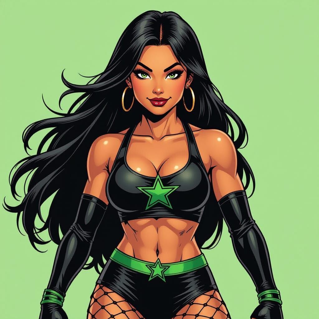 This image depicts a young Latina wrestler in a vibrant comic book style. She wears a black and green outfit and has a mischievous expression, captured with dramatic lighting and a low-angle perspective.
