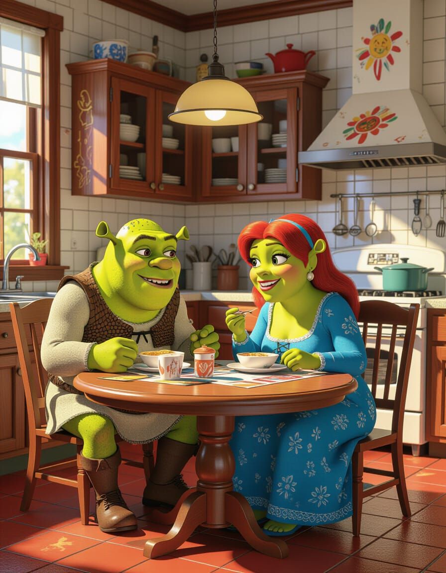 Design unique Shrek and Fiona breakfast images with our free and easy AI generator. Start creating now!