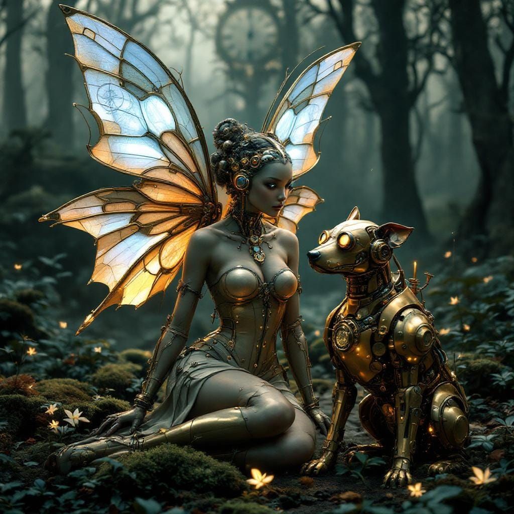 A striking picture of a steampunk fairy in an industrial forest. The half-human, half-machine woman has mechanical wings and stands next to a wind-up mechanical dog, rendered in a hyper-detailed steampunk aesthetic.