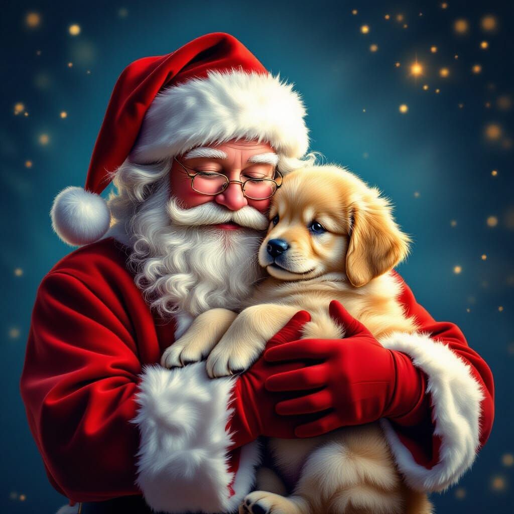 This image shows Santa Claus tenderly holding a fluffy golden retriever puppy. Rendered in a detailed matte painting style with dramatic lighting.