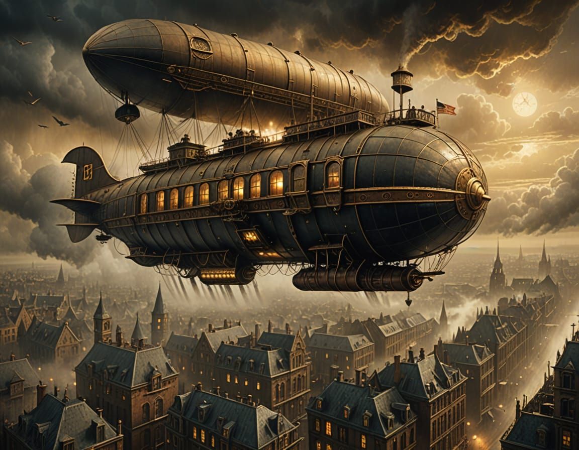 A striking picture of a steampunk zeppelin soaring above a city. The artwork features a vintage, industrial aesthetic with golden lighting shining through dark, misty clouds.