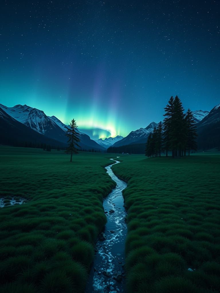 A serene landscape of a valley surrounded by snow-capped mountains, with a dark green meadow and a sparkling river, under a deep night sky with northern lights and tall pine trees.