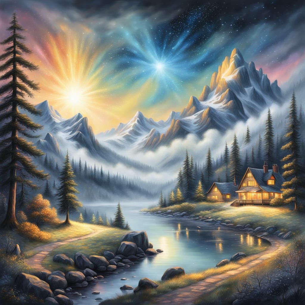 This image shows a stunning landscape with stars shining above. The artwork employs thick brushstrokes and vibrant colors to create a dreamy, ethereal fantasy in an impressionistic style.