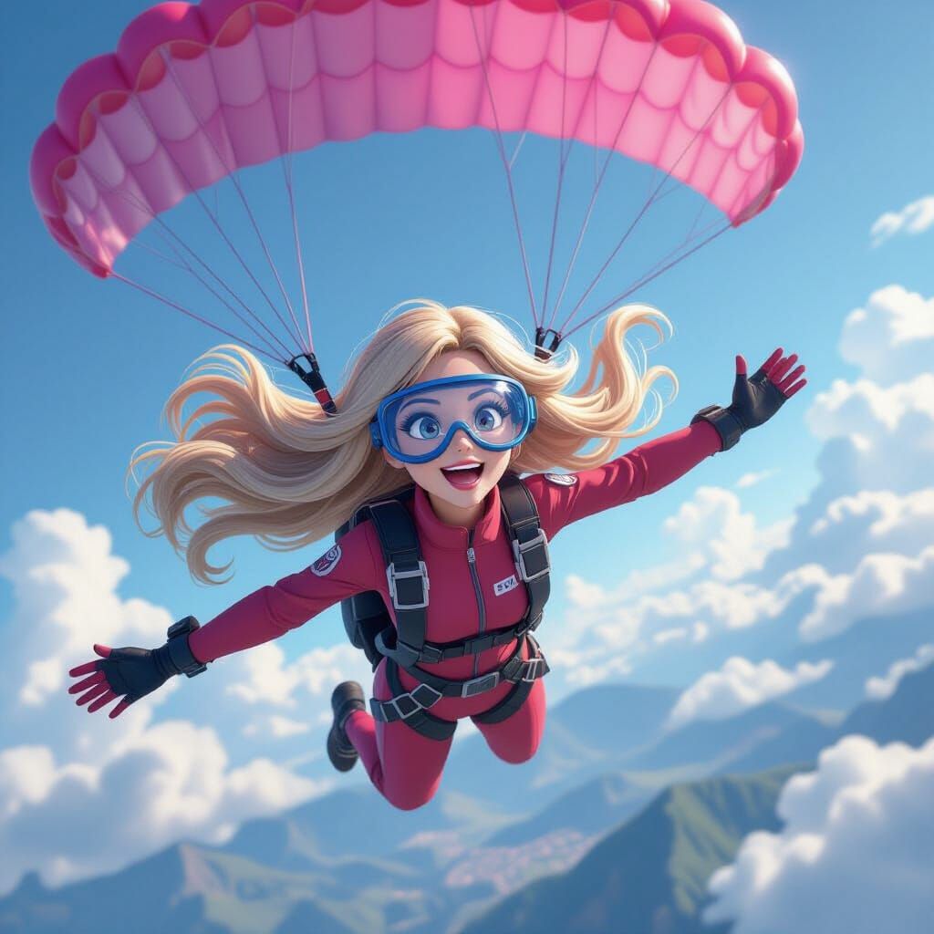 This image shows a sassy blonde woman with long hair and blue safety glasses leaping from a plane with a vibrant pink parachute. Rendered in a detailed 3D anime aesthetic, it features dynamic lighting and colors.