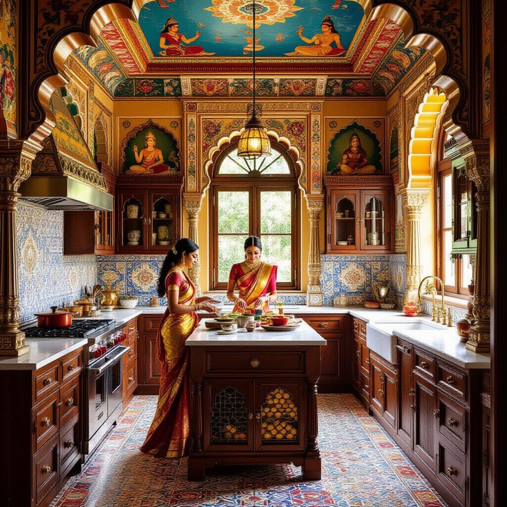 This image shows an elegant woman cooking in a lavish, ornate kitchen. The design incorporates elements of ancient Indian palaces, with vibrant colors and rich detailing. The artwork is reminiscent of classic Indian paintings.