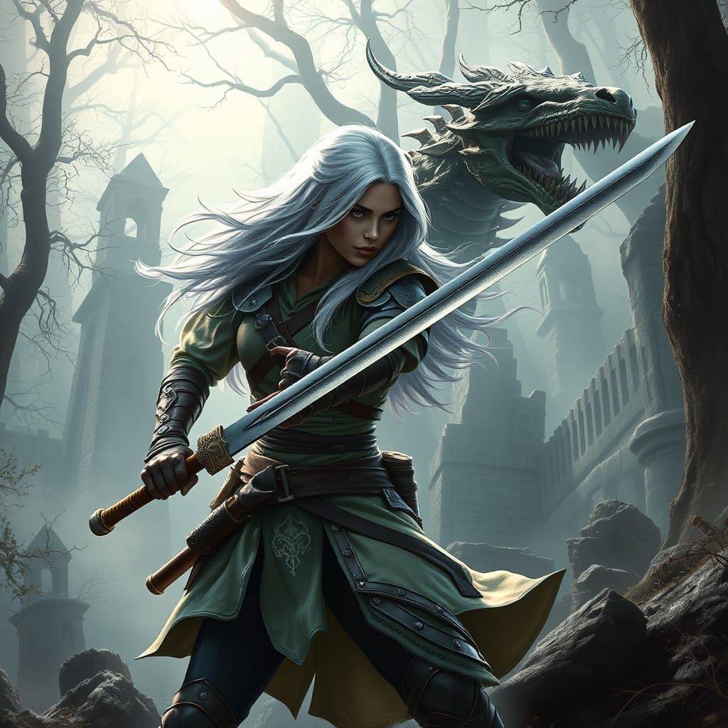 This image shows a fierce female warrior battling a skeleton dragon in a mystical, foggy forest with ancient ruins. The scene is lit with soft ethereal light and features intricate armor and photorealistic high fantasy details.