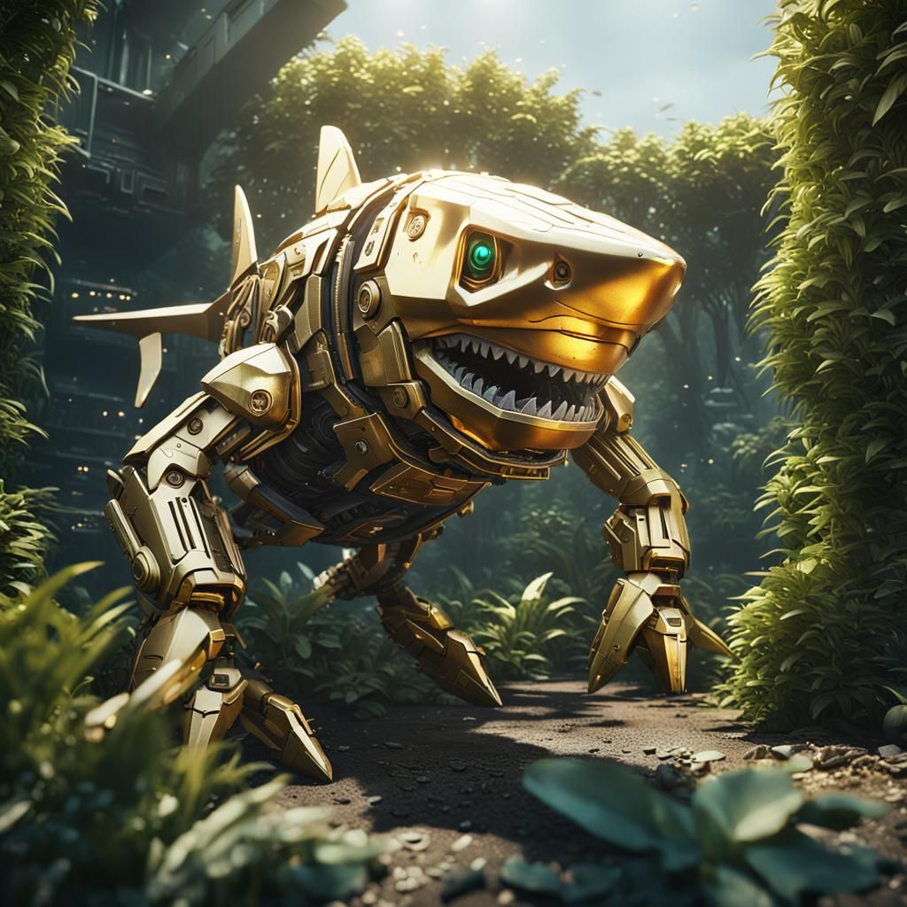 A cinematic image of a shark-headed man searching for a gold coin. The scene features intricate mechanical details, polished metal, and a dramatic, atmospheric sci-fi aesthetic, rendered with advanced 3D techniques.