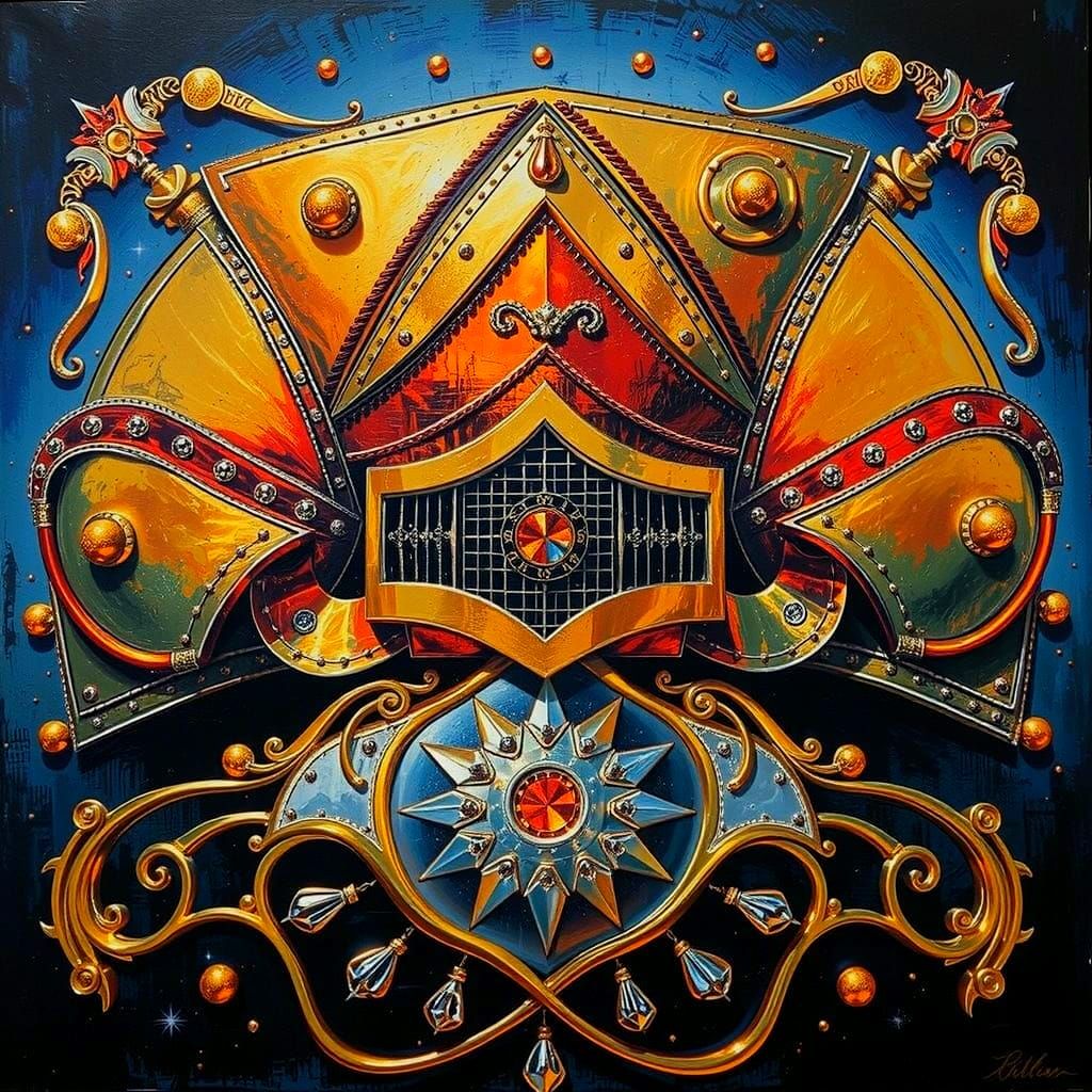 This image showcases a brilliant composition of metallic elements, featuring gold, silver, brass, and chrome with a polished, shiny finish and captivating reflections.