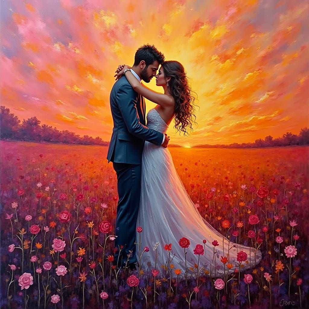A vibrant painting of a couple embracing during a sunset. This artwork captures a romantic moment with bold brushstrokes and clashing colors, in an expressionist style.