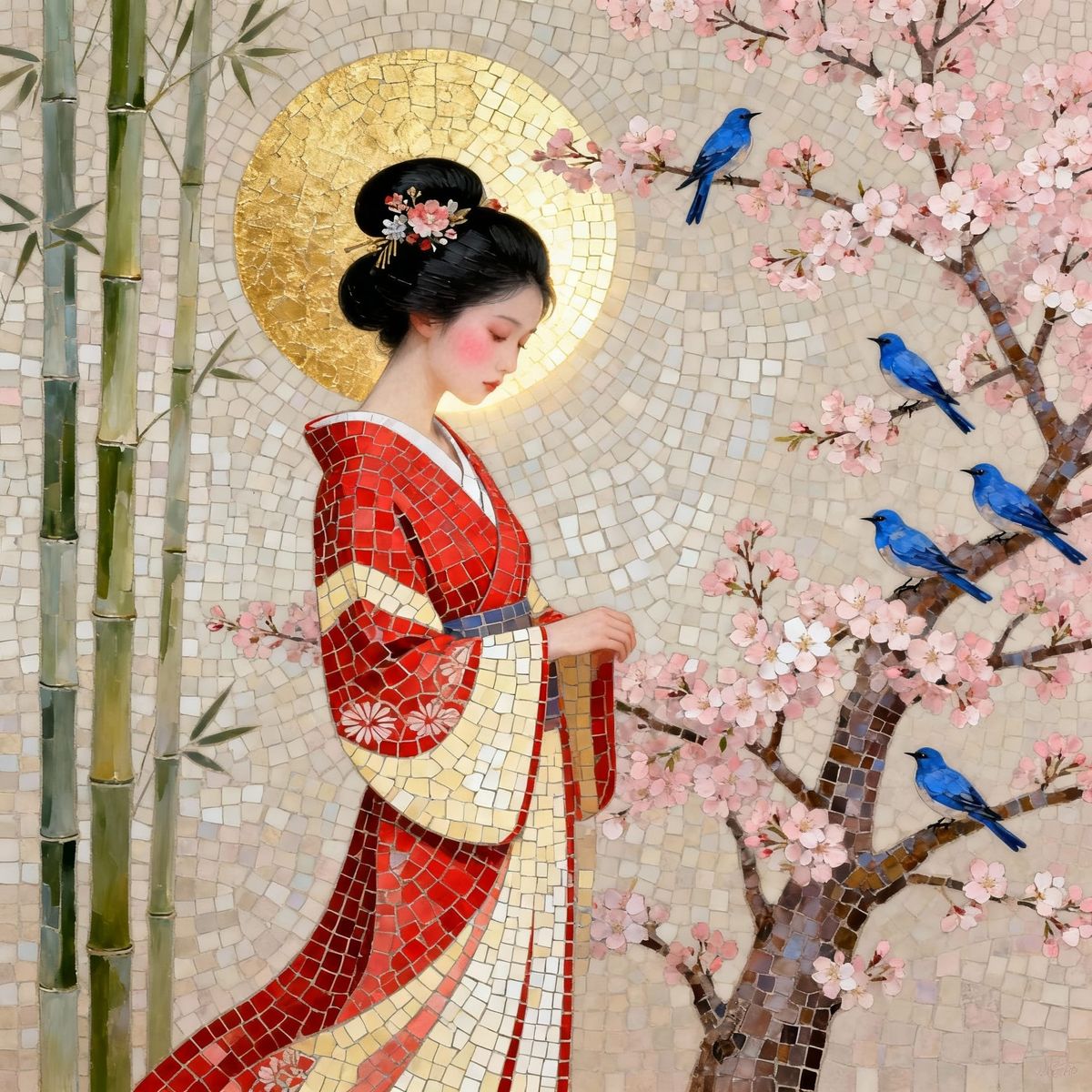 A serene, mosaic-style artwork featuring an elegant East Asian woman in a traditional kimono standing near a blossoming cherry tree, a full moon in the background, and several blue birds perched on branches. The woman, of East Asian descent, appears in her late twenties, with smooth pale skin, rosy cheeks, ...