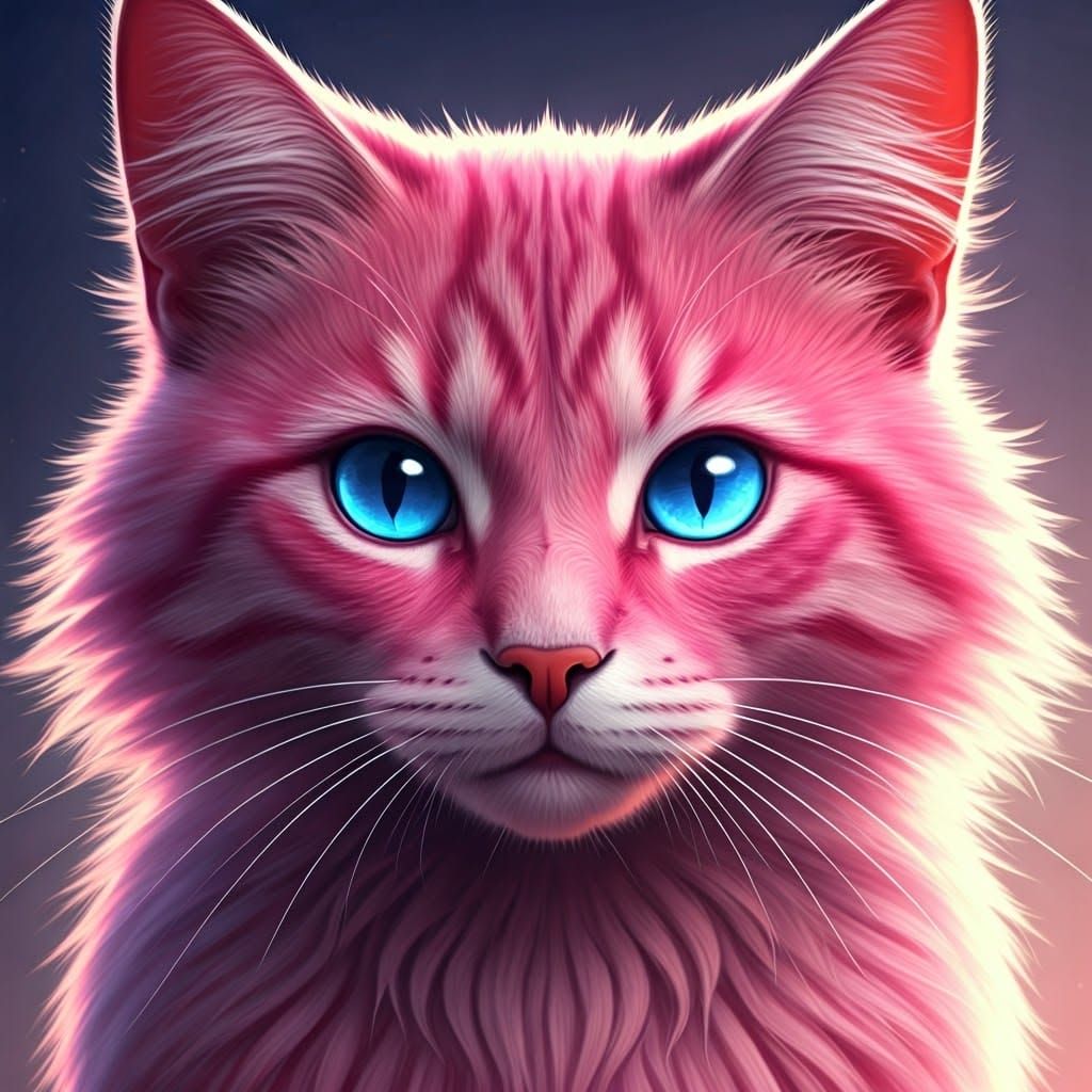 A vibrant image of a pink cat with striking blue eyes and a fluffy tail, against a shimmering backdrop. It is rendered in a dynamic anime and concept art style, with highly detailed textures.
