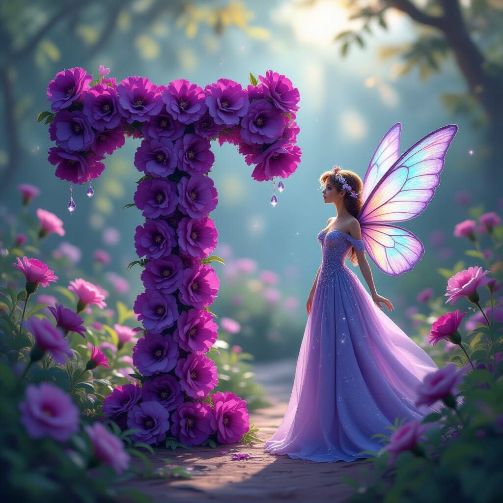 A capital letter T made of purple carnations with dew drops, beside a delicate fairy with iridescent wings in a whimsical garden. Rendered in a magical realism style with luminous colors and intricate detail.