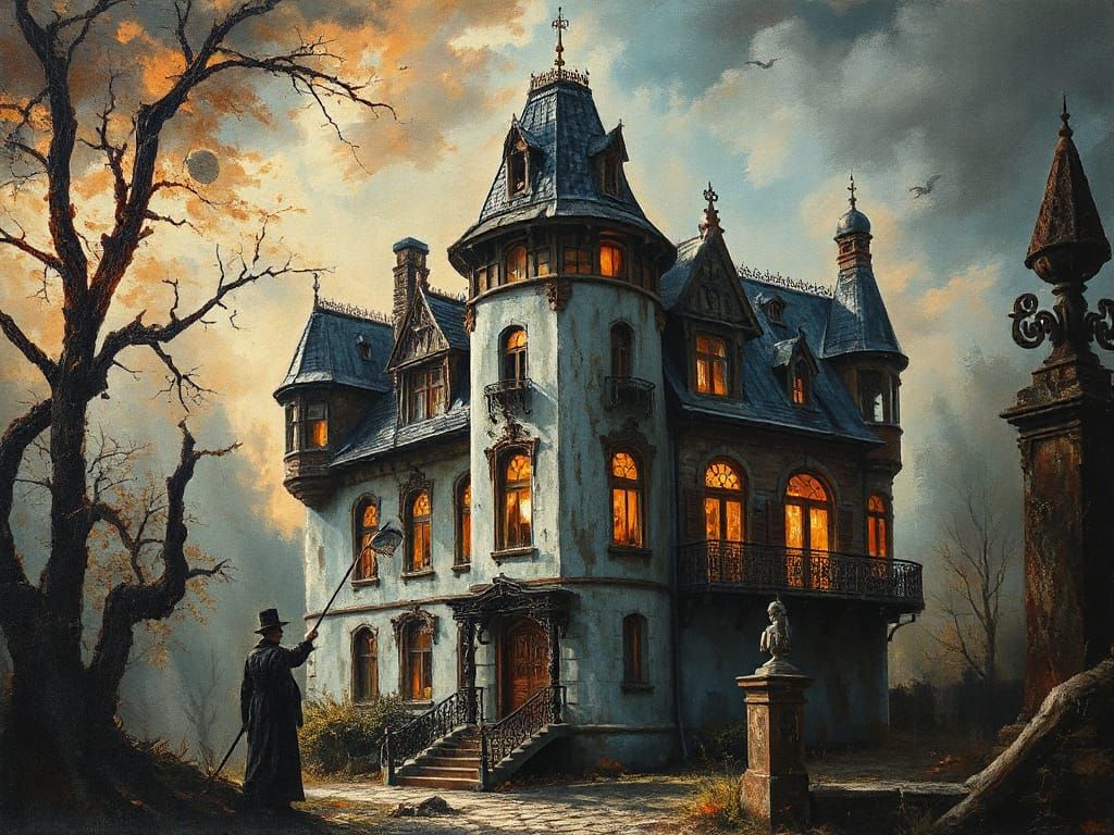 This image showcases a sinister Halloween castle, rendered as a realistic brushed oil painting with impasto texture and vivid, shimmering colors. It captures intricate details and cinematic lighting.