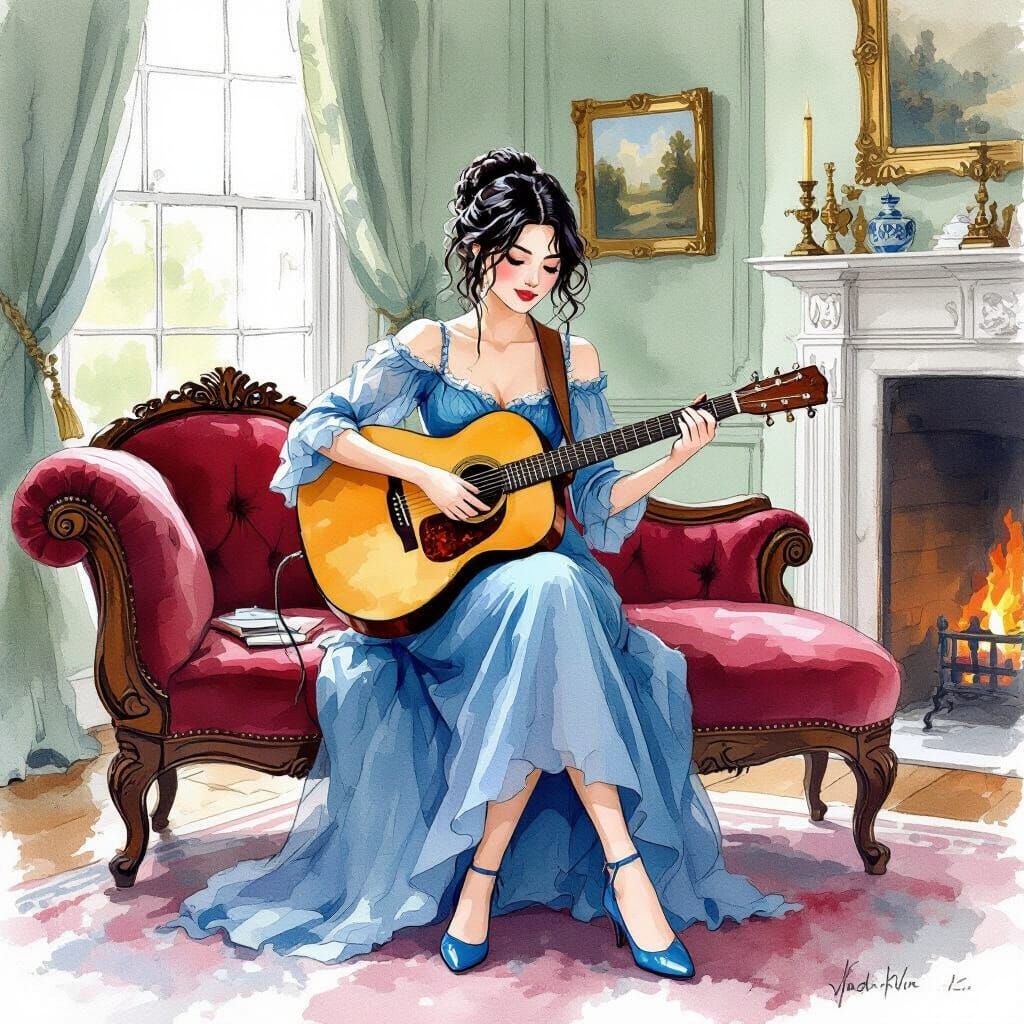 A dreamy watercolor image shows a slender, dark-haired woman in a blue dress playing guitar. The scene is set in an ornate 18th-century room with soft, ethereal brushstrokes.