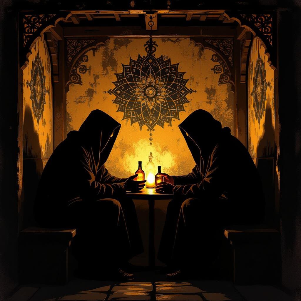 This image shows a clandestine meeting within a dimly lit, ornate sukkah, rendered in the dramatic chiaroscuro style of old masters. Two figures exchange a glowing bottle amidst unsettling celestial patterns.