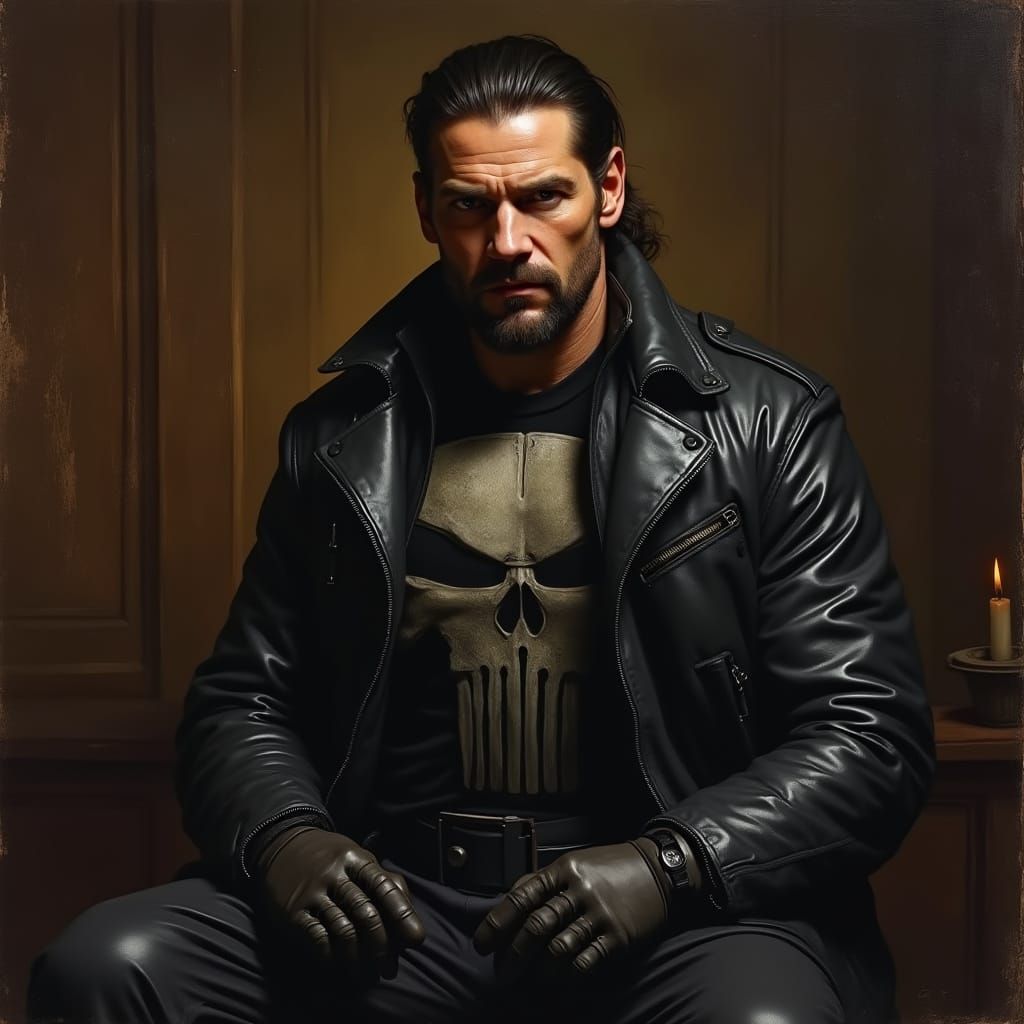 A dramatic portrait of Frank Castle, The Punisher, in the style of 17th-century Dutch Master Rembrandt, with warm golden tones, chiaroscuro lighting, and intricate details, set against a rich, moody backdrop.