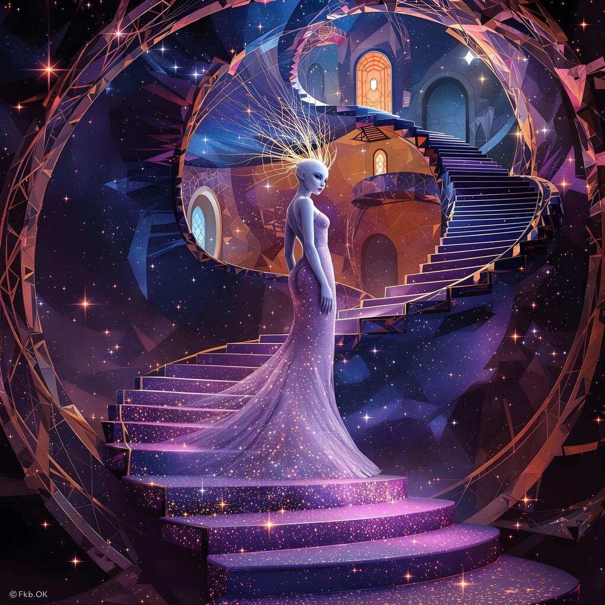This image shows a beautiful alien woman in a stardust dress standing on spiral stairs. Doorways appear along the way in this surreal, shimmering, cosmic digital painting.
