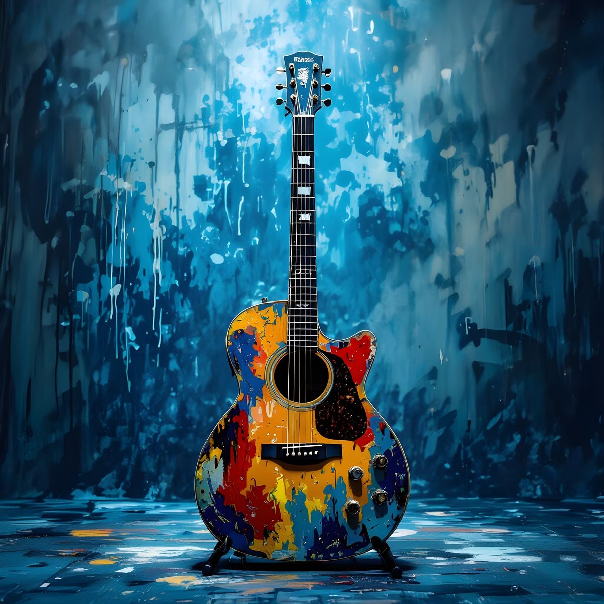 A cinematic film still captures a guitar transitioning from a pencil sketch background to vibrant oil paints, bathed in atmospheric, blue-toned light. Masterfully composed with film grain and dramatic lighting.