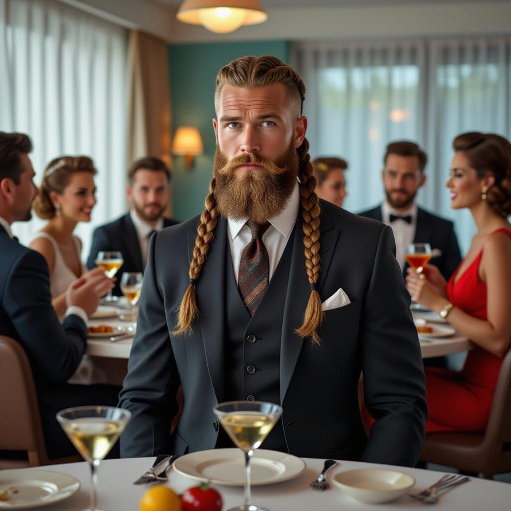A humorous image of a bewildered Viking warrior at a 1950s cocktail party. The scene, filled with vibrant colors and sharp details, creates an anachronistic, Wes Anderson-inspired aesthetic.