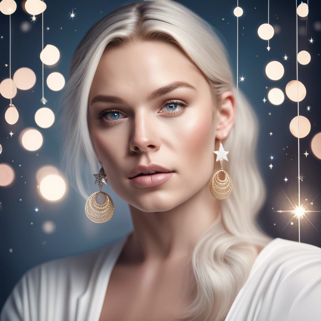 Beautiful curvy woman swedish model,grey blue eyes,soft pink lips,wears long white gold earrings and long white gold necklaces,wears white outfit,background glowing stars and night