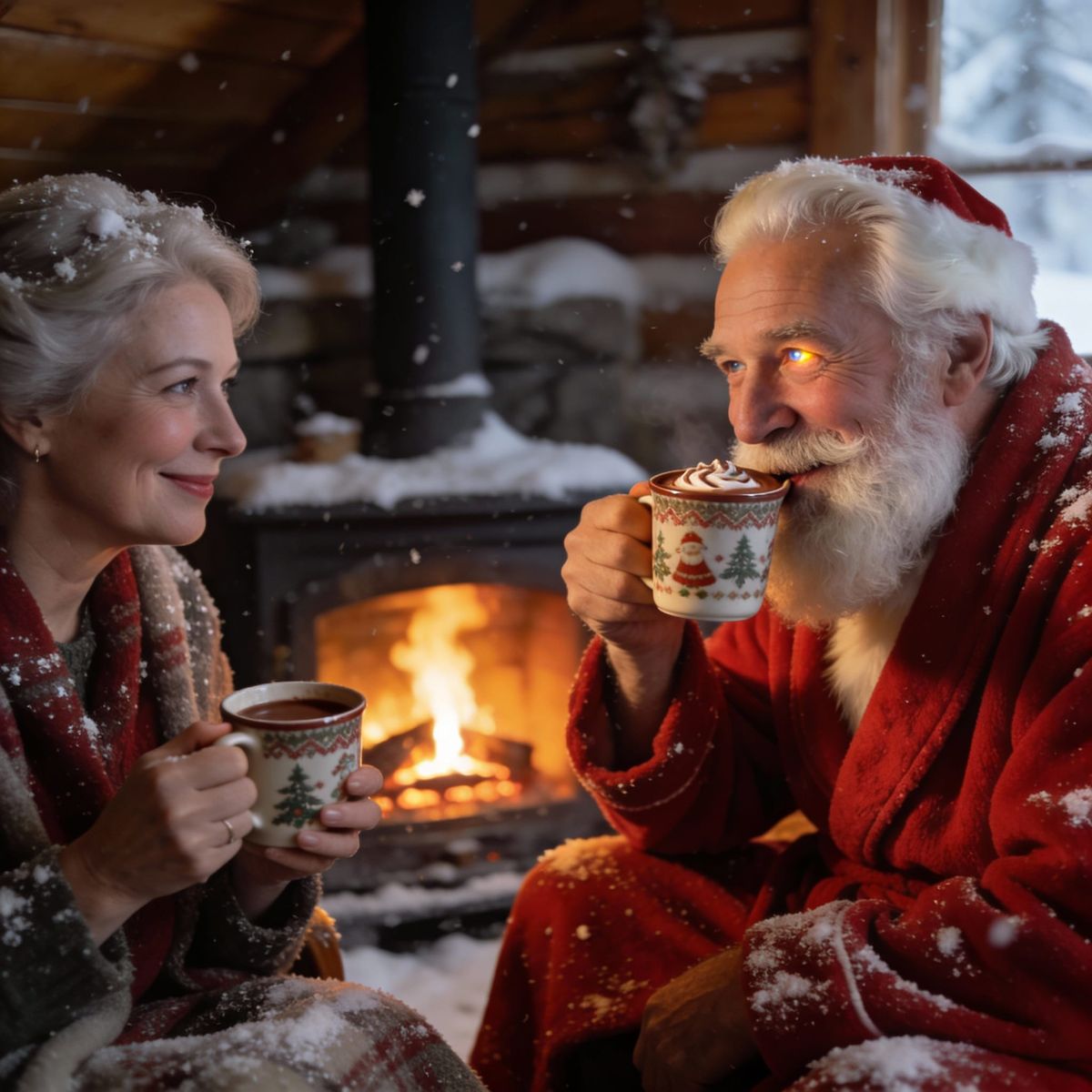 This image shows a realistic Santa Claus and his wife sharing a warm moment with hot chocolate in a cozy, firelit cabin. Rendered with cinematic detail and a warm color palette.