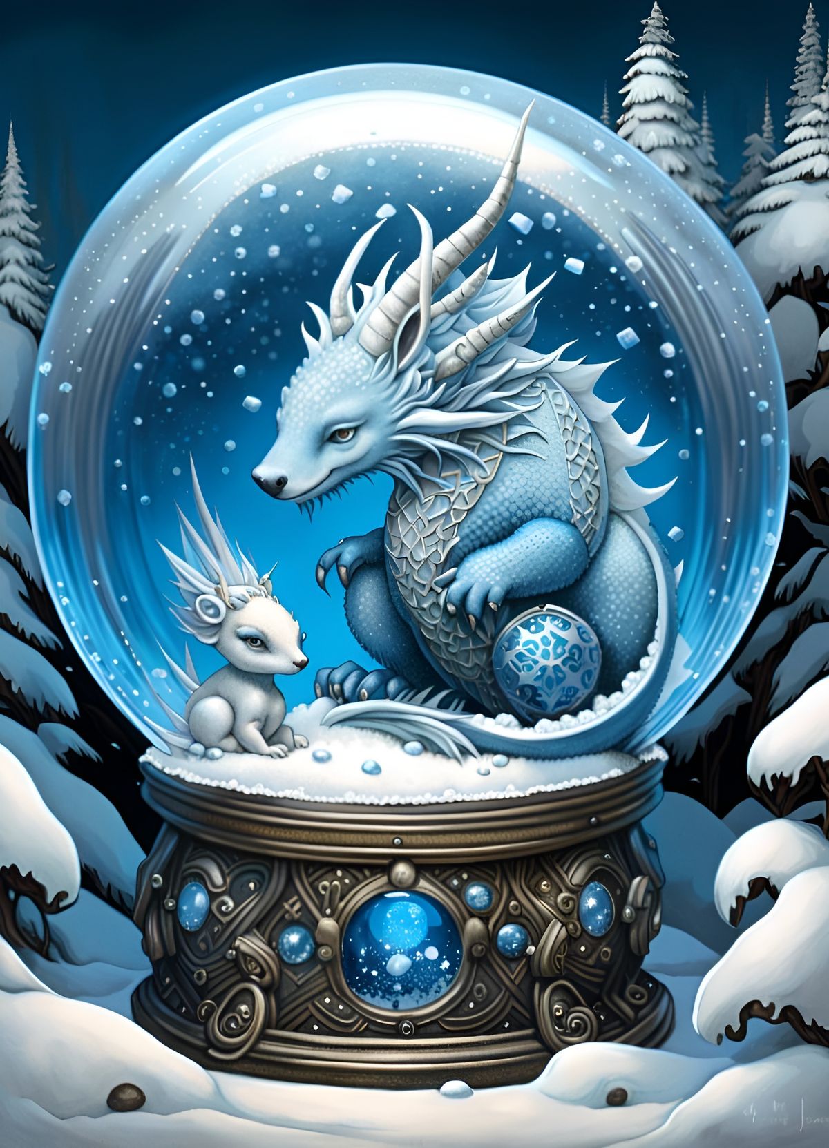 This image shows a beautiful snow globe containing a frozen winter scene. The artwork features icy details, snowflakes, and a blue and silver color scheme, reminiscent of surrealist fantasy art.