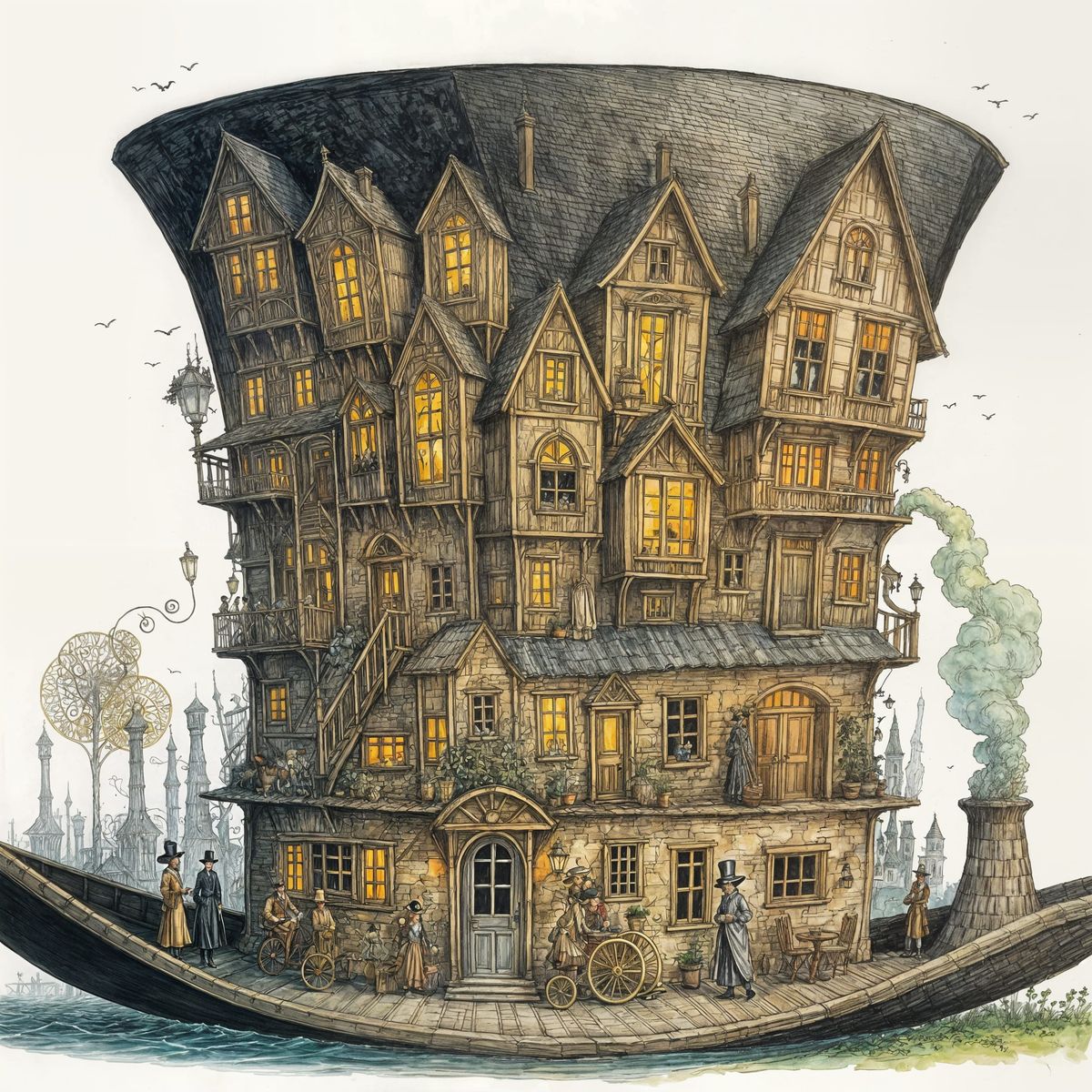 This image shows a tall top hat whimsically transformed into a multi-story house. The illustration evokes the Golden Age, with surreal elements and watercolor techniques typical of the era.