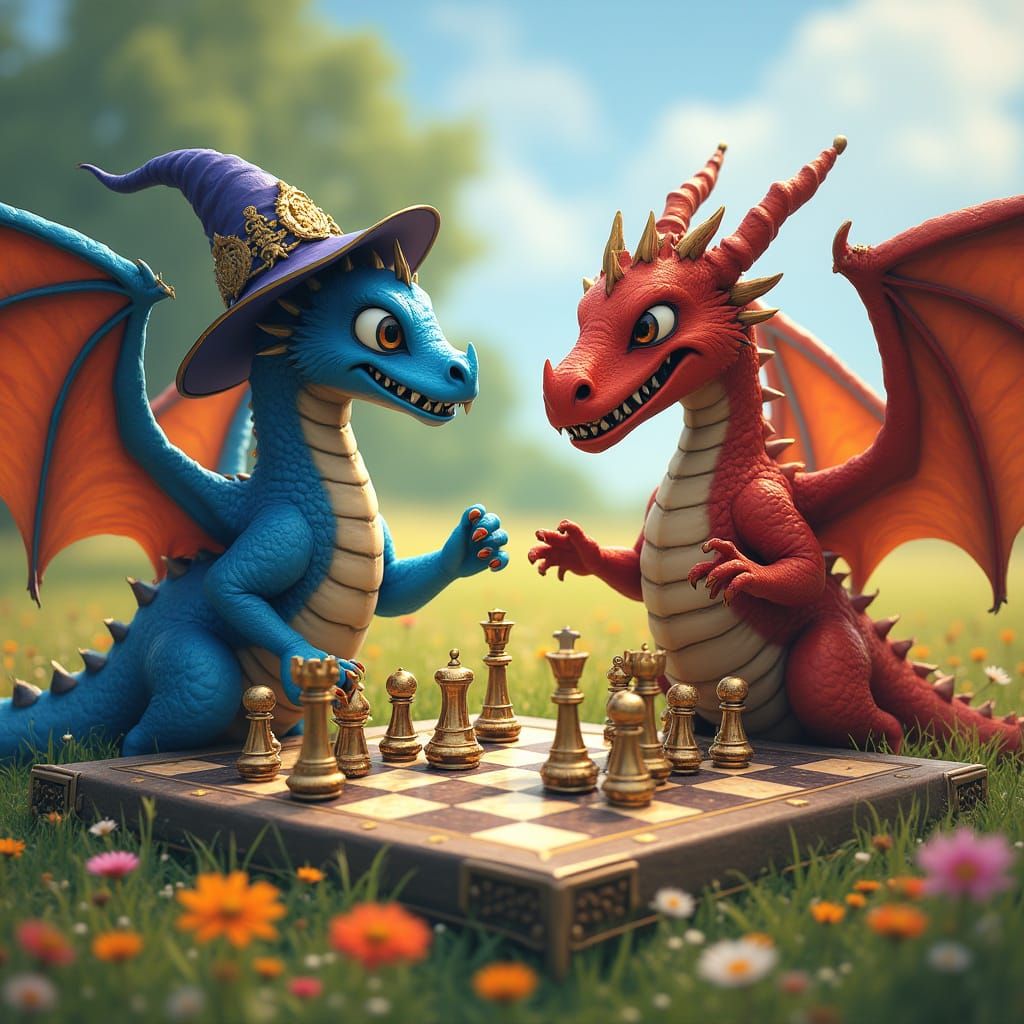 This image shows two dragons engrossed in a chess match within a sun-drenched meadow. The scene features intricate textures and realistic lighting, reminiscent of digital artwork.